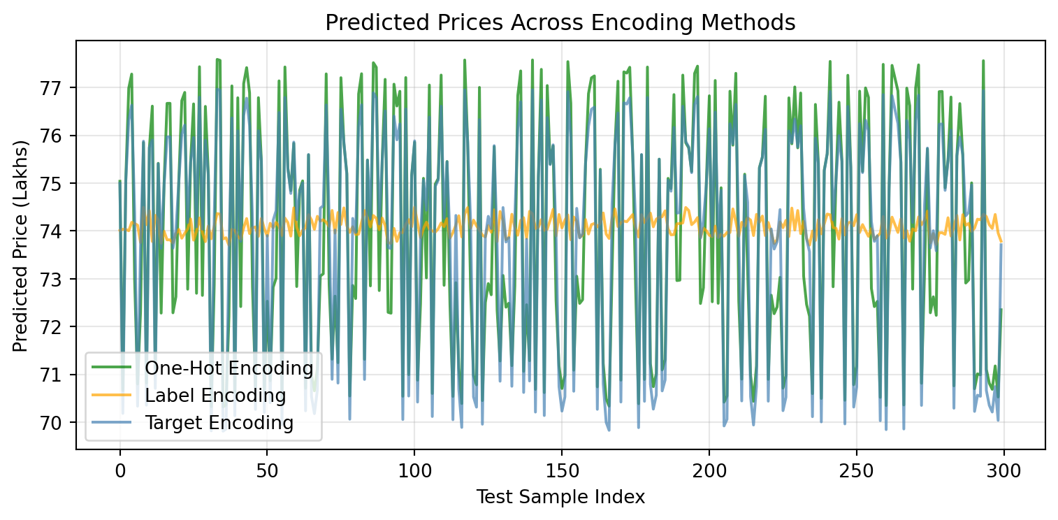Target Encoding (blue line) which fluctuates between about 70 and 77 lakhs, somewhat similar to one-hot encoding but with different patterns.